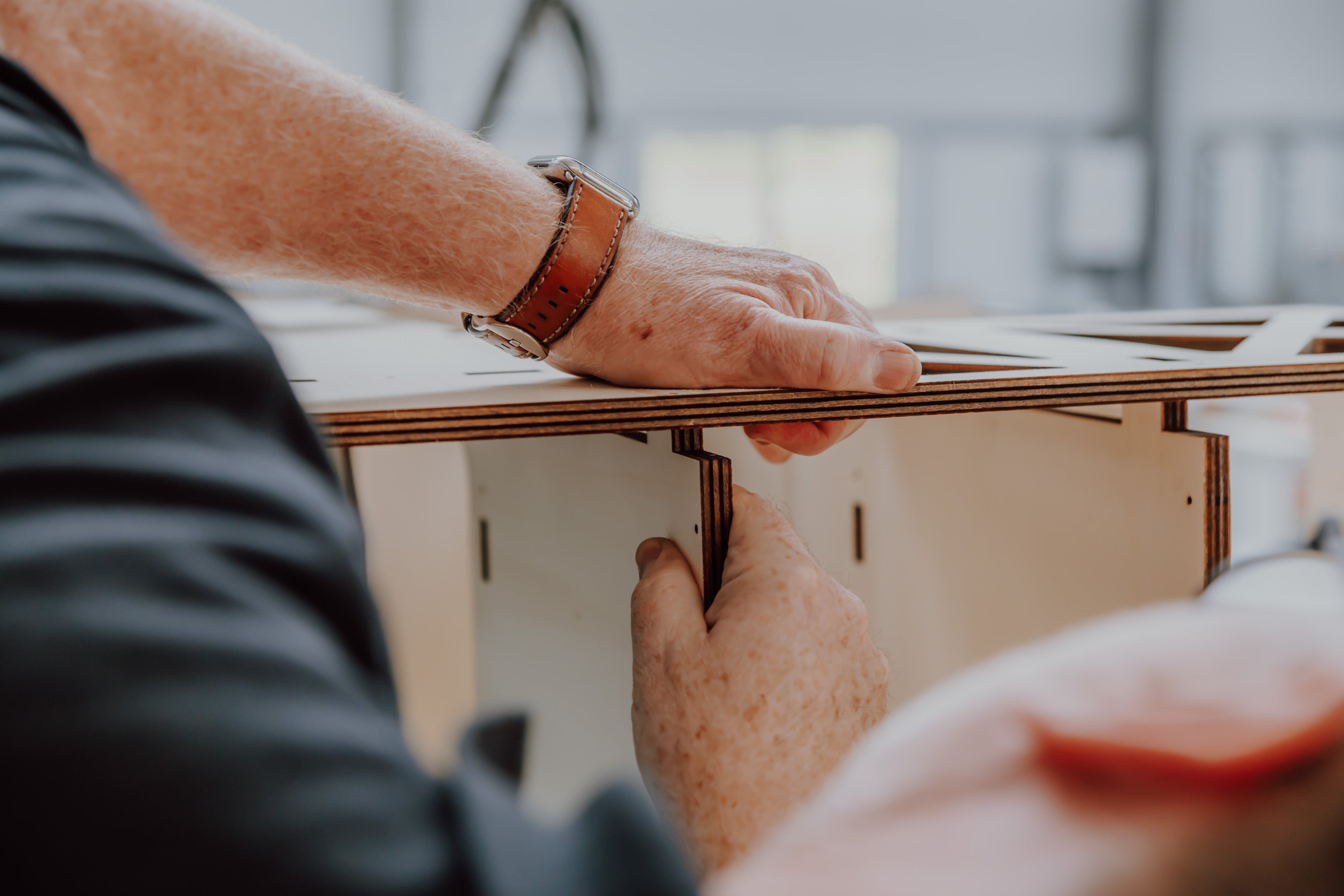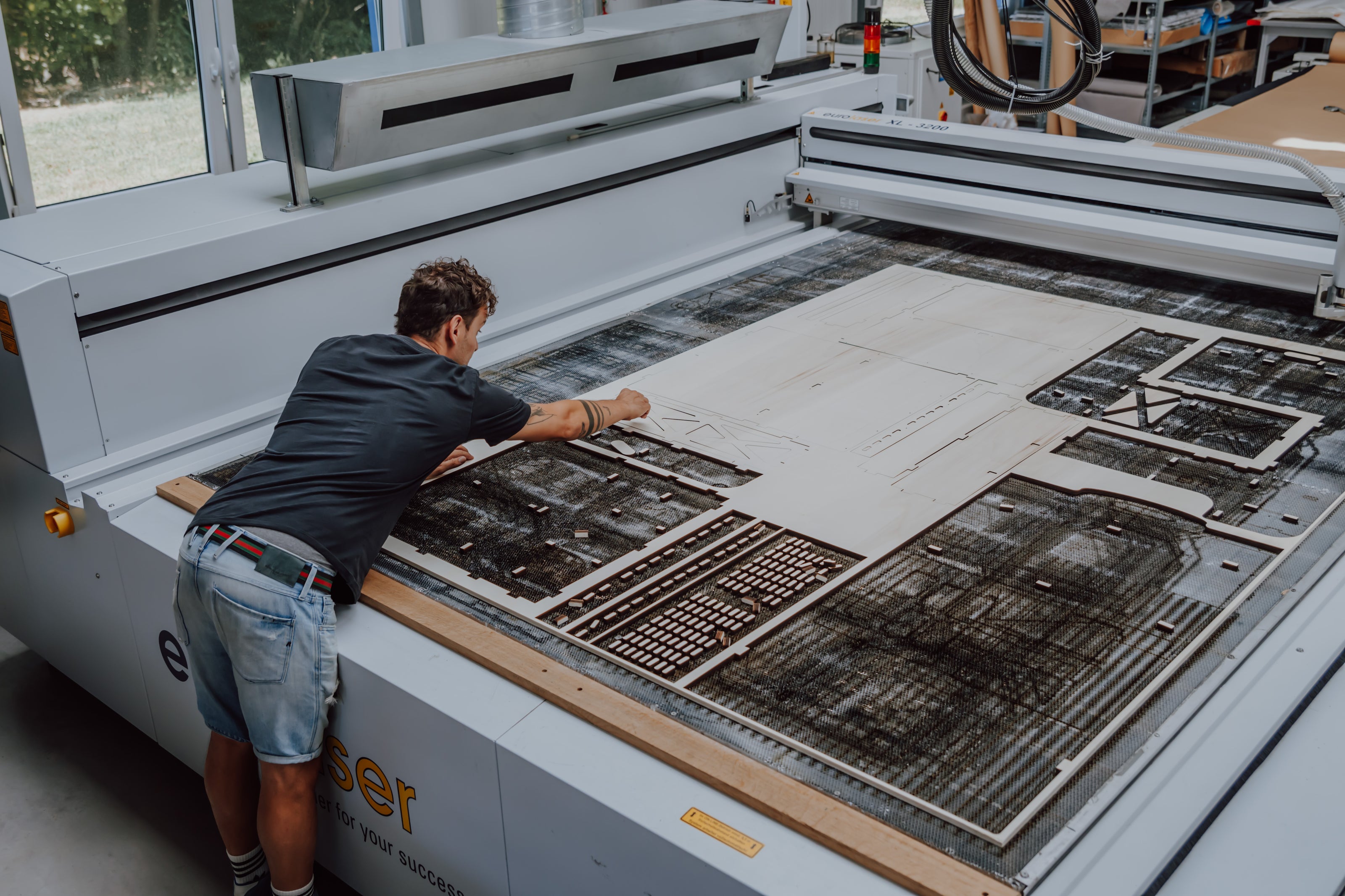 Die Einzelteile der Terobox werden im Schwarzwald aus einer großen Pappel-Multiplexplatte gelasert. Danach wird sie zusammengesteckt und zusätzlich verschraubt. Wahlweise bauen wir deine Terobox direkt mit Schwerlastschienen in deinen Van ein.